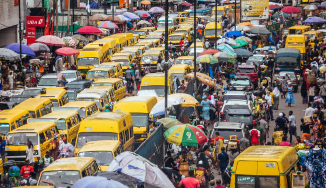 Danfo buses in Lagos together with street merchants and pedestrians.